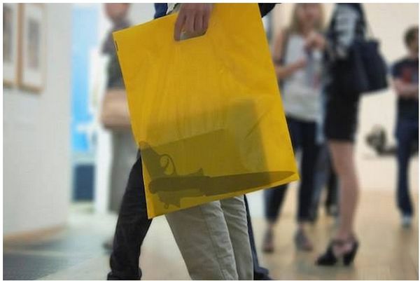 他們在全黃色的購物膠袋上,印上危險物品的剪影,乍看一下,還以為袋子裡真的藏有了危險物,這種購物膠袋拿在手裡不但路人回頭率高,還可能會莫明奇妙的惹來警察的監視。